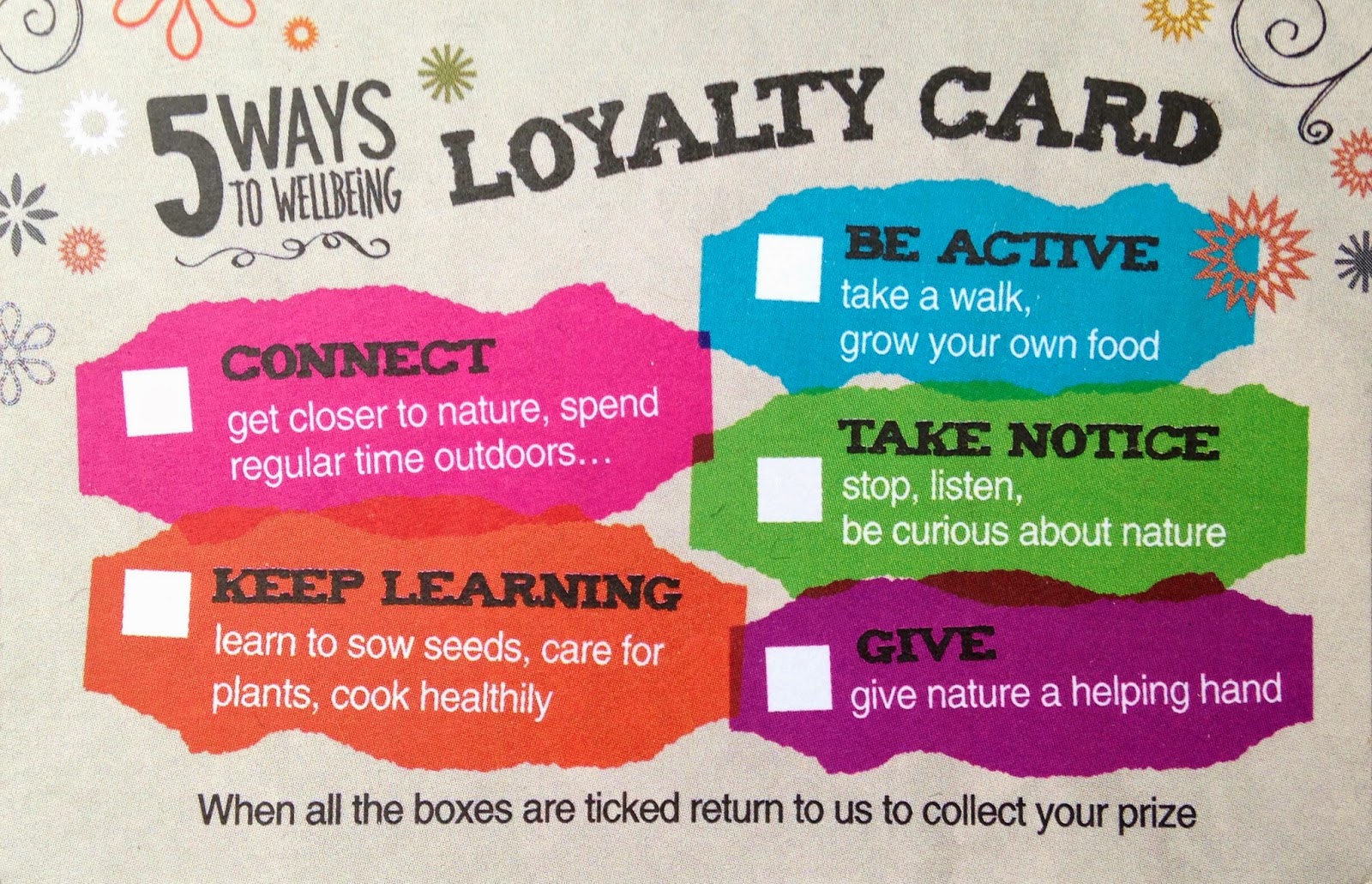 Here’s a great example from the National Wildflower Centre which summarises the ‘5 Ways’ as outdoor actions, and on a ‘loyalty card’: